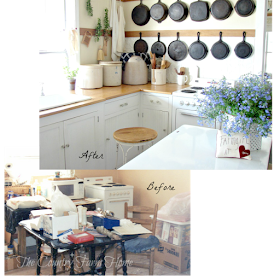 The large crocks on the counter serve as 'upper cabinets'. . .